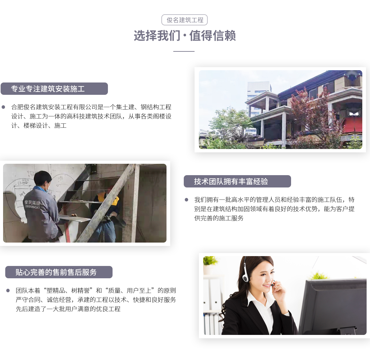 合肥俊名建筑安裝工程有限公司是一個集土建、鋼結構工程設計、施工為一體的高科技建筑技術團隊,從事各類閣樓設計、施工。我們擁有一批高水平的管理人員和經驗豐富的施工隊伍,特別是在建筑結構加固領域有著良好的技術優(yōu)勢。團隊員工精誠團結,以“尊重規(guī)范,拒絕平凡”為宗旨,為客戶提供完善的施工服務。團隊本著“塑精品、樹精譽”和“質量、用戶至上”的原則,嚴守合同、誠信經營,所...